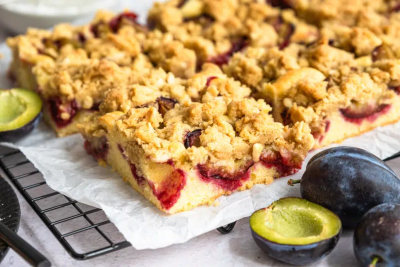 Alles zu einem krümeligen Teig verkneten und auf dem Kuchen verteilen. Den Zwetschgen-Streuselkuchen auf mittlerer Schiene ca. 30 Minuten backen und gegen Ende der Backzeit mit einem Holzstäbchen prüfen, ob der Kuchen durchgebacken ist.