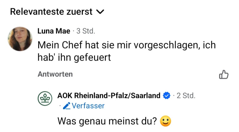 Sie: " Ist mir egal. Entweder du befolgst es, oder du gehst 2 Gassen weiter zum und beim Wirten!"
