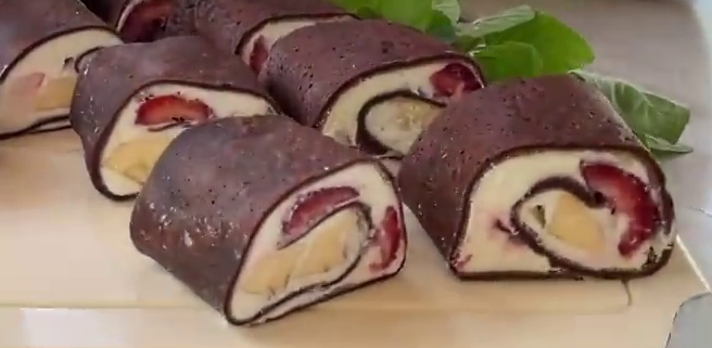 - Die Käsecreme auf den Kuchen verteilen, darauf Erdbeeren und Bananen legen und zusammen rollen.