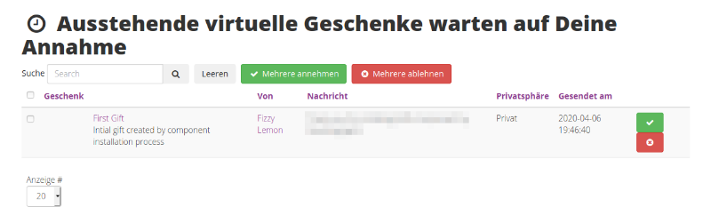 Wenn Du ein Geschenk von einem Mitglied erhalten hast, bekommst Du eine eMail und nach dem Einloggen in die Community eine Benachrichtigung beim Glockensymbol. Klicke diese Benachrichtigung an und Du gelangst direkt zur Liste Deiner ausstehenden Geschenke, die Du nun annehmen oder ablehnen kannst. Auf dem Smartphone kann man die Liste verschieben, um so an die Buttons ganz rechts zu gelangen. Natürlich kannst Du auch mehrere Geschenke anhaken und dann mit den Buttons "Mehrere annehmen" oder "Mehrere ablehnen" in einem Rutsch abarbeiten. Solltest Du aber die Benachrichtigungen gelöscht haben, ist das auch kein Beinbruch, denn in eingeloggtem Zustand ist für Dich in der Navigationsleiste oben unter Community ein Unterpunkt "Ausstehende virtuelle Geschenke" verfügbar. Damit kommst Du auch zu dieser Seite.
