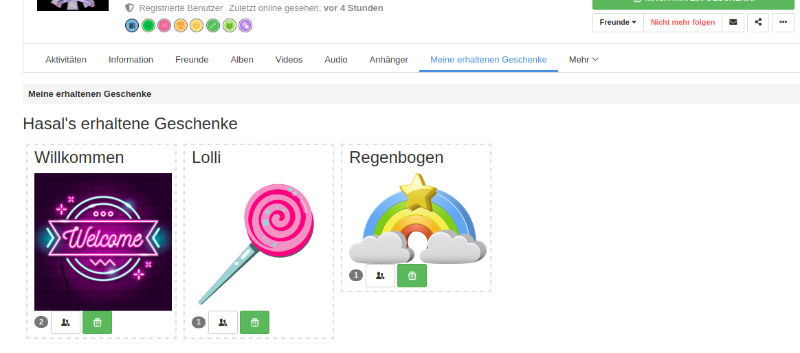 Erst wenn ein Geschenk angenommen wurde, taucht dieses in Deinem Profil unter dem Reiter "Meine erhaltenen Geschenke" auf. Smartphonenutzer müssen die Zeile der Reiter verschieben, um diesen antippbar zu bekommen. Das Bild eines jeden Geschenks taucht nur einmal auf. Links darunter steht die Anzahl, wie oft man dieses Geschenk schon bekam. Mit dem Button daneben kann man eine Liste aufrufen, auf der alle Schenker und ihre Nachrichten für dieses Geschenk an Dich verzeichnet sind. Mit dem grünen Button daneben ist es Dir möglich, dieses Geschenk auch an jemanden zu machen.