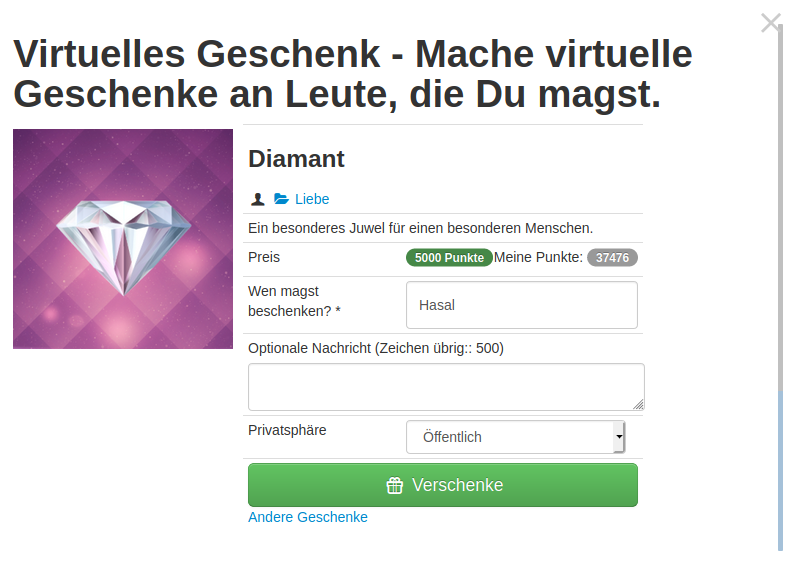 Rufe dazu das Profil des Mitglieds auf, das Du beschenken möchtest und klicke im sog. Profilkopf auf den Button "MACH MIR EIN GESCHENK!". Daraufhin öffnet sich eine Box mit der Auswahlliste aller zur Verfügung stehender Geschenke. Selbstverständlich kannst Du die Suche verwenden, um ein bestimmtes Geschenk zu finden oder Du klickst auf eines der Kategorieschlagworte, die Dir dabei helfen, den Wust an Geschenken etwas zu sortieren und übersichtlicher darzustellen. Hast Du Dich für ein Geschenk entschieden, das Dir gefällt und Du es Dir auch leisten kannst, dann musst Du nur auf den grünen Button rechts darunter klicken und gelangst zum "Bestellformular".