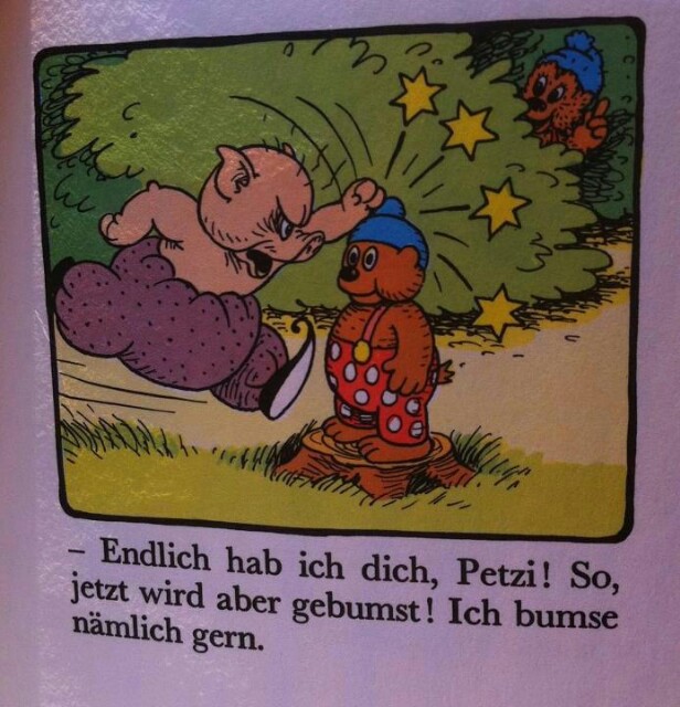 1963 gab es die "Petzi"-Kinderbücher, von denen eines bei Sammlern vor allem in der Erstübersetzung heiß begehrt ist. In "Petzi als König" kommt das Kloppschwein vor, das in der Erstübersetzung noch Bumstier hieß und es liebte zu bumsen.^^
